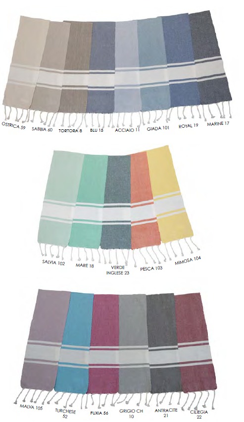 ACCIAIO, ANTRACITE, BLU, BLU ROYAL, CILIEGIA, FUCSIA, GIADA, GRIGIO, MALVA, MARE, MARINE, MIMOSA, OSTRICA, PESCA, SABBIA, SALVIA, TORTORA, TURCHESE, VERDE INGLESE