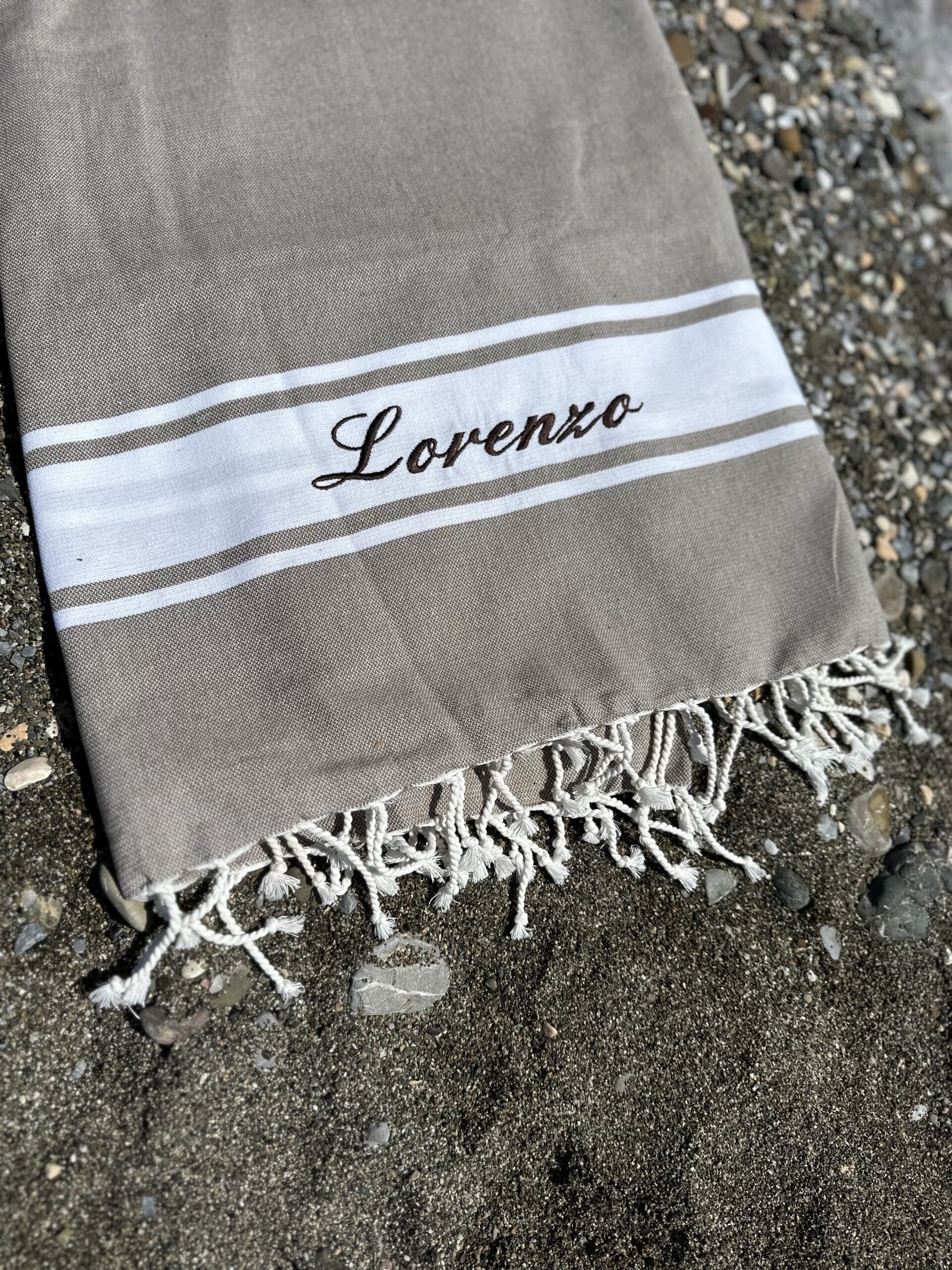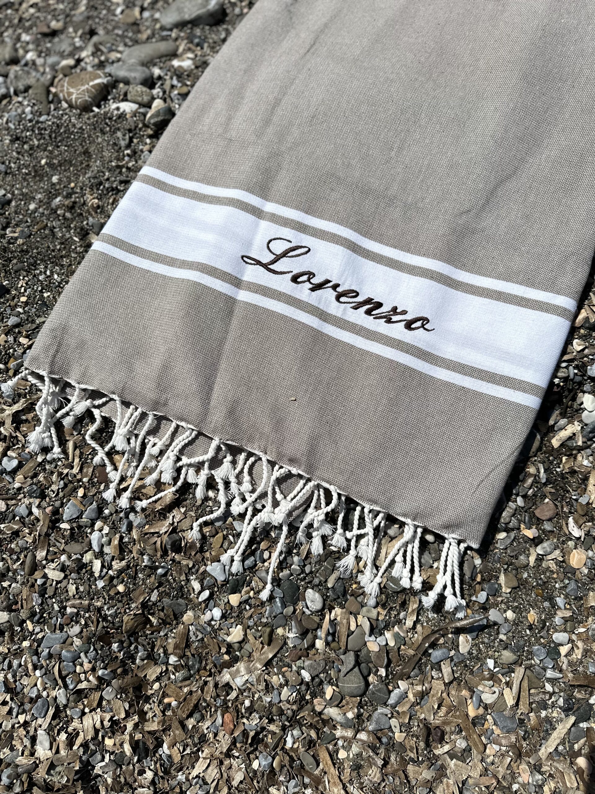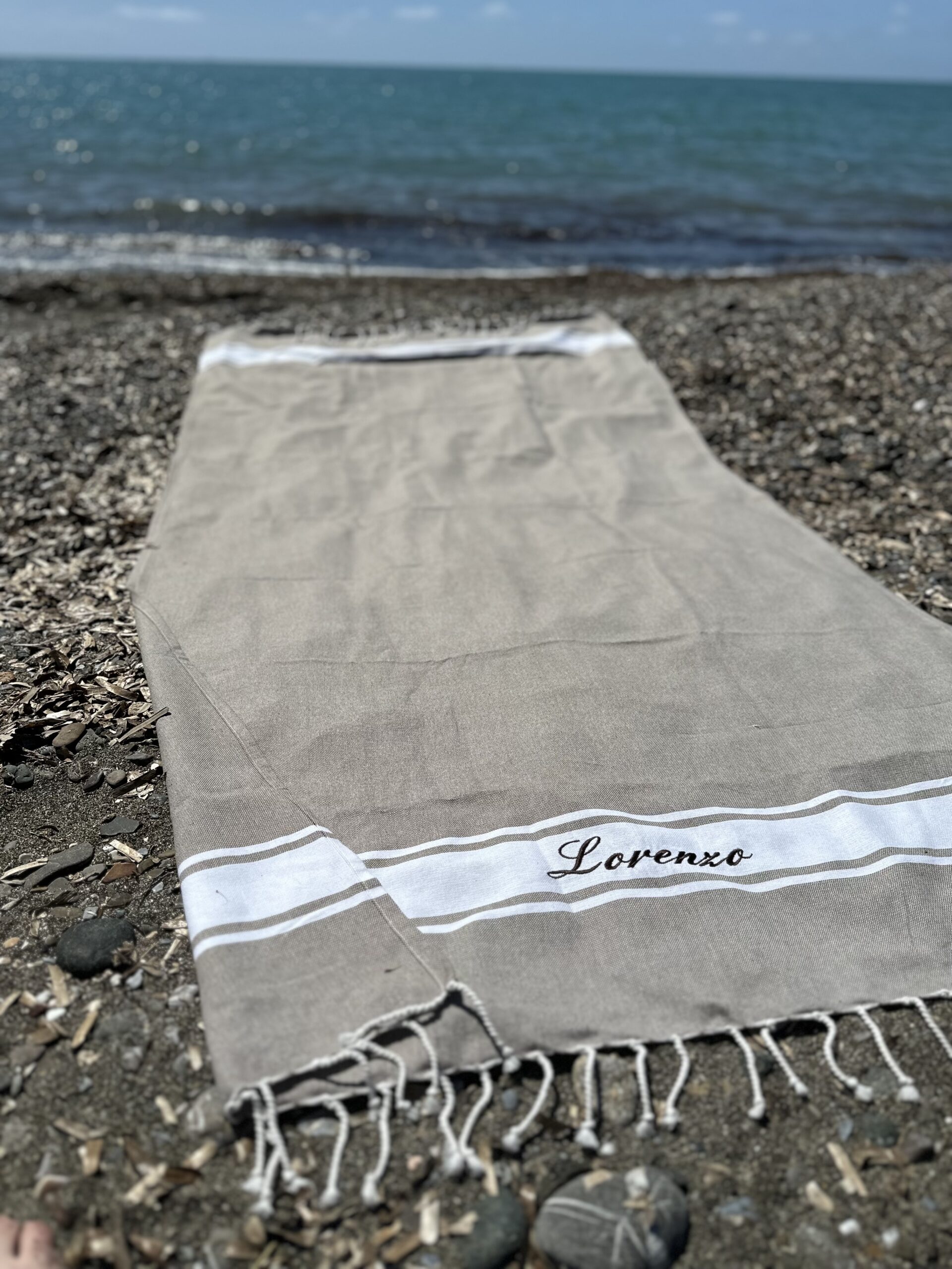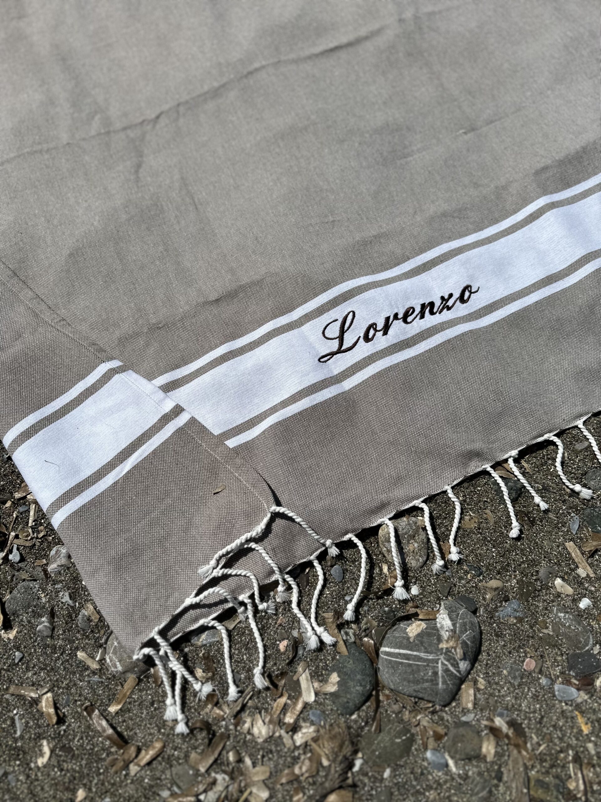 Realizzato in fouta 100% cotone, è leggero, compatto e si asciuga in un attimo. Ma la vera magia è nel ricamo: il tuo nome o le tue iniziali (o quello di chi ami) viene cucito con cura in corsivo per un risultato elegante e unico.