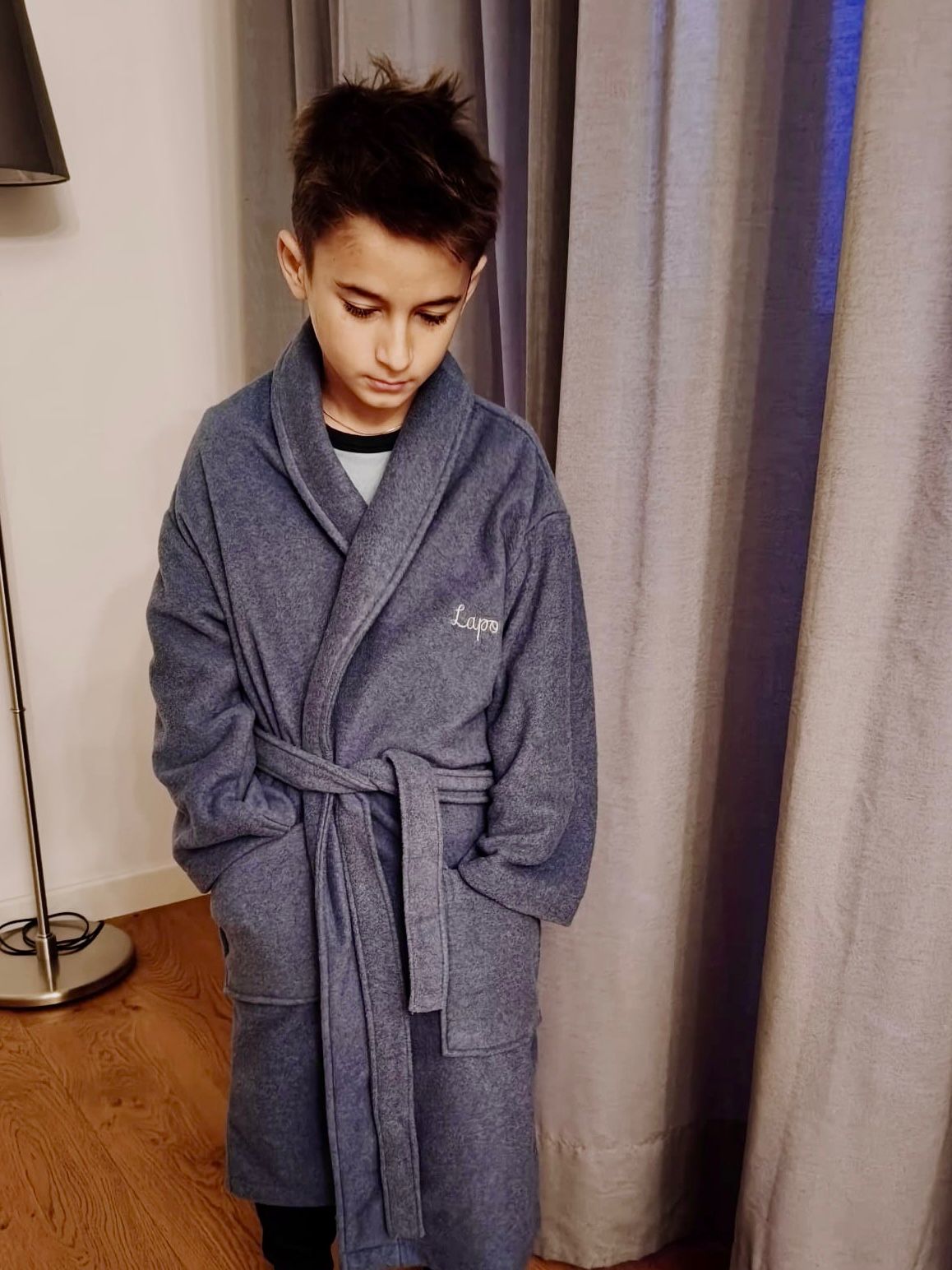 Questa Vestaglia bambino pile personalizzato è dotata di due comode tasche frontali, ideali per tenere al caldo le mani o custodire piccoli tesori, e di una cintura coordinata per una chiusura semplice e confortevole. Il vero valore aggiunto, però, è la personalizzazione con il nome del bambino: un dettaglio speciale che rende la vestaglia davvero unica e inconfondibile.